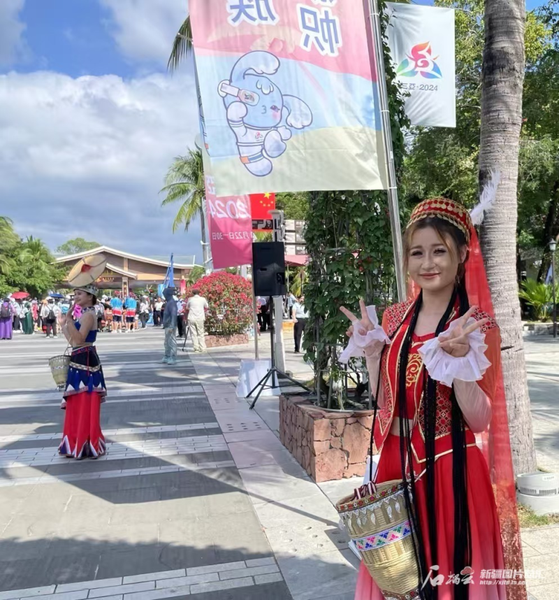 歡迎儀式的人群中,一頭麻花辮的艾麗非熱·艾爾肯非常引人注意,很多運(yùn)動員前去與她合影,“我們排練一個(gè)月了,我要用最好的狀態(tài)為運(yùn)動員加油,今天看見了很多家鄉(xiāng)的運(yùn)動員,特別激動,等我表演完就去找他們合影?!卑惙菬峤榻B,她家在新疆阿克蘇,在三亞理工職業(yè)學(xué)院上大二,這幾天每天都在關(guān)注運(yùn)動會的各類信息。