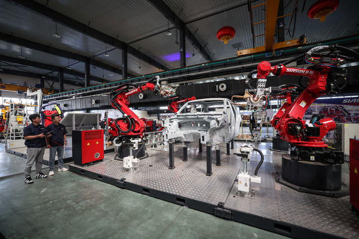2024年6月3日,沈陽新松機(jī)器人自動化股份有限公司的機(jī)器人研發(fā)工程師在測試驗(yàn)證為點(diǎn)焊機(jī)器人新開發(fā)的功能。新華社記者 潘昱龍 攝