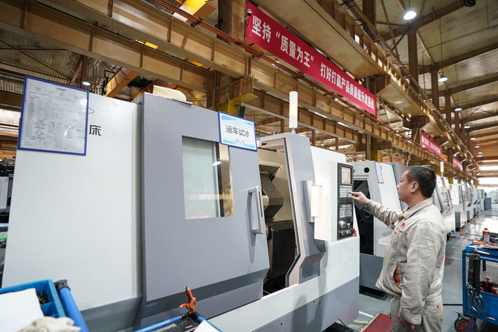 2024年3月21日,在沈陽微控飛輪技術(shù)股份有限公司,工人在機(jī)加車間操控機(jī)床。新華社記者 楊青 攝