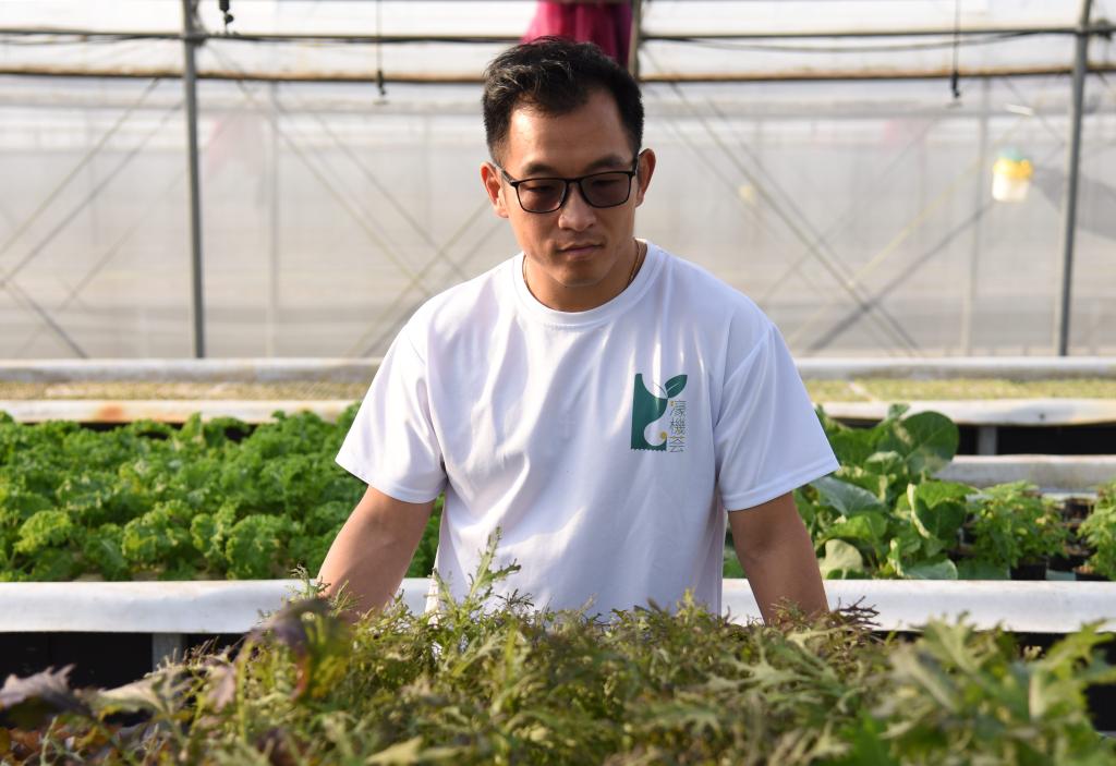 在珠海市金灣區(qū)紅旗鎮(zhèn)的一處農(nóng)場,翠綠的菜葉盡情伸展,工人們正利用流水線快速采摘成熟的蔬菜。澳門青年孫振鴻和合作伙伴穿著雨靴在大棚中忙碌。