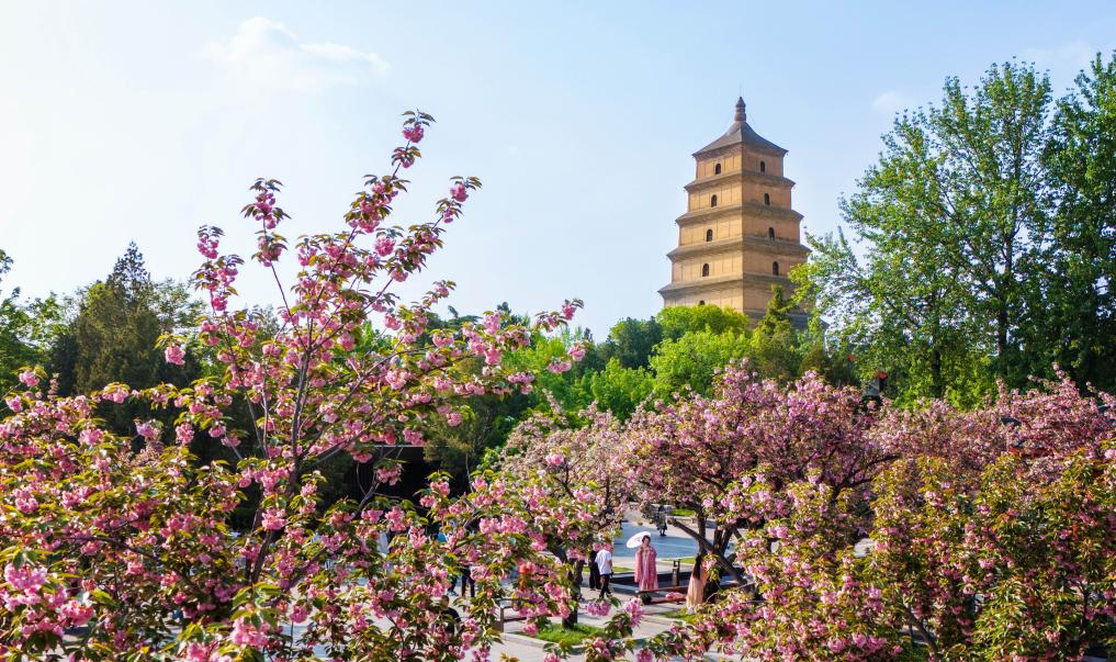 游客在西安大雁塔下游覽(無(wú)人機(jī)照片,2024年4月10日攝)。 新華社記者 鄒競(jìng)一 攝