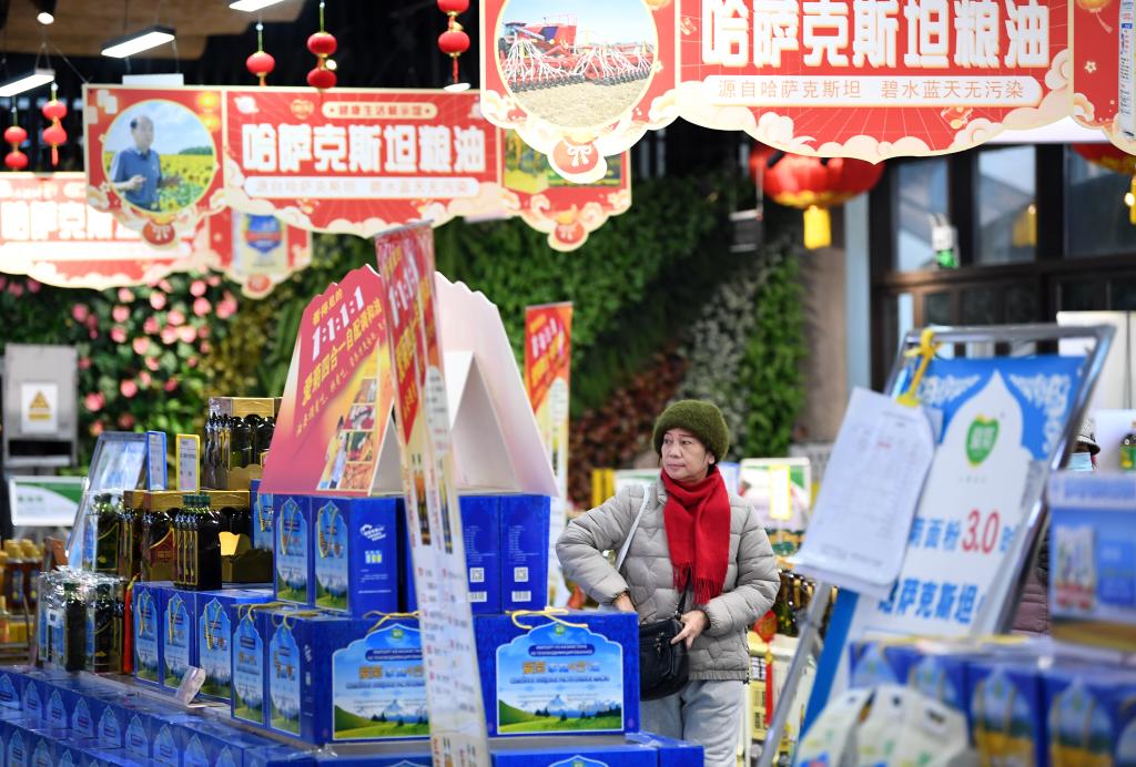 消費(fèi)者在“中歐班列(西安)進(jìn)口商品年貨節(jié)”上挑選哈薩克斯坦糧油產(chǎn)品(2024年2月1日攝)。 新華社記者 李一博 攝