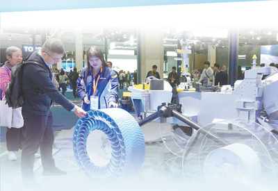 第七屆中國國際進(jìn)口博覽會上,觀眾正在了解米其林月球探測車輪胎?!√?克攝