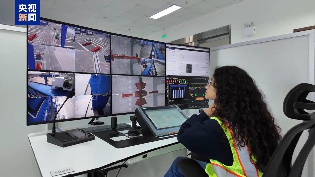在遠(yuǎn)程操作區(qū),我們看到,通過(guò)電腦控制系統(tǒng)即可實(shí)現(xiàn)港口裝卸的全自動(dòng)化操作。員工無(wú)需再攀上高高的吊機(jī),只需坐在控制臺(tái)前,通過(guò)多角度實(shí)時(shí)監(jiān)控屏和搖桿手柄,便能精確完成數(shù)百噸甚至上千噸集裝箱的裝卸任務(wù)。