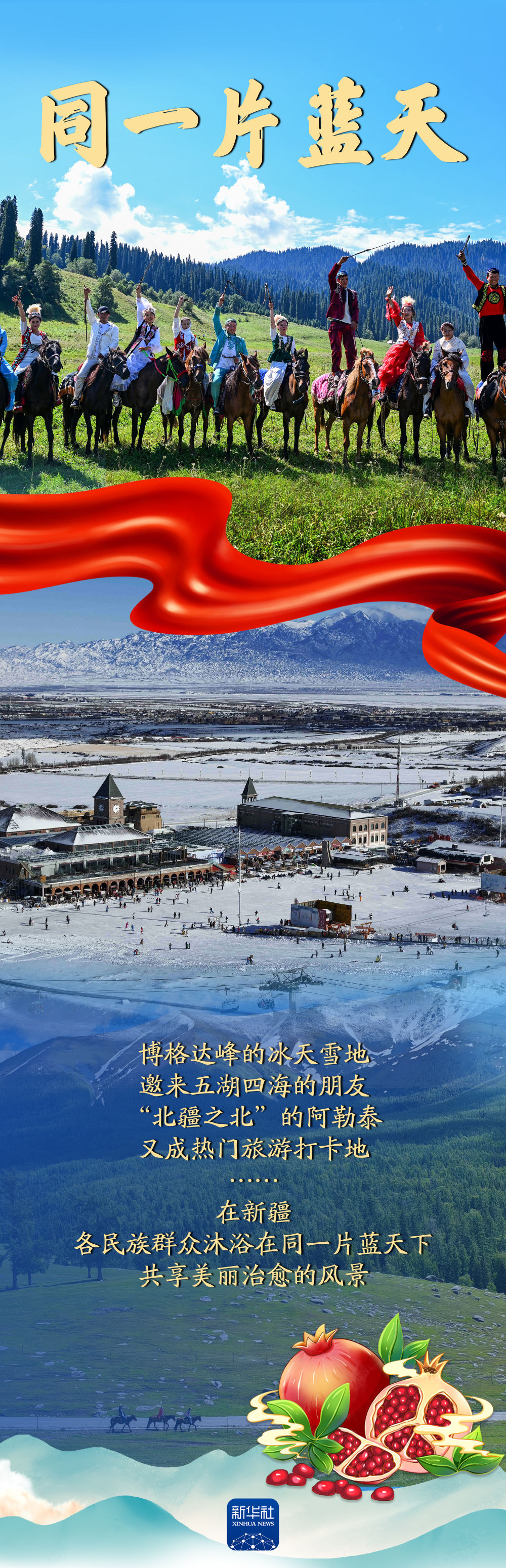 同一片藍(lán)天,同一個(gè)家園,同一條道路……在新疆,各族群眾“像石榴籽一樣緊緊抱在一起”,同心同德、同甘共苦,共同創(chuàng)造幸福美好的生活。讓我們跟隨這組海報(bào),重溫這一年各族群眾“同”在新疆的故事。