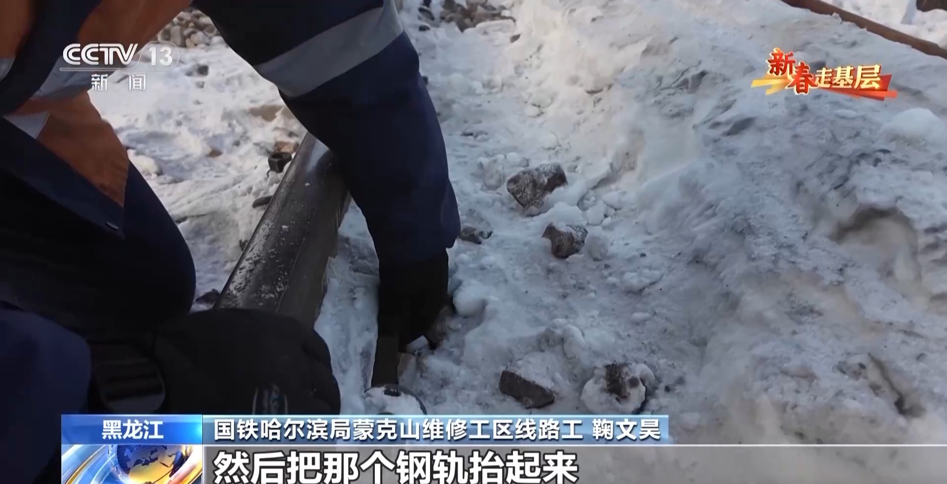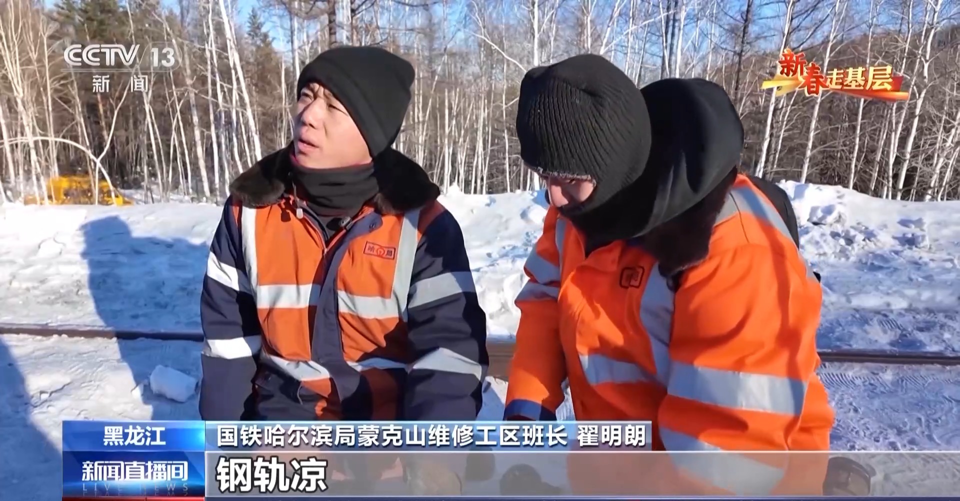 國(guó)鐵哈爾濱局蒙克山維修工區(qū)班長(zhǎng) 翟明朗:冬天因?yàn)闅鉁乇容^低,鋼軌涼,然后手熱,它碰著鐵直接就粘住了。不能直接往下拽,容易給皮拽下來(lái)。