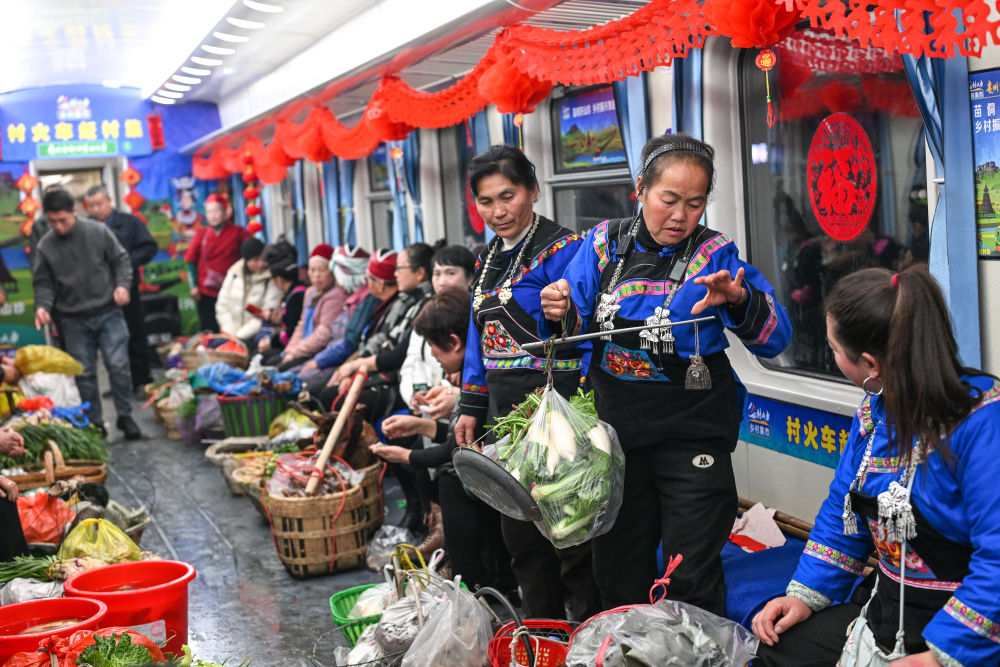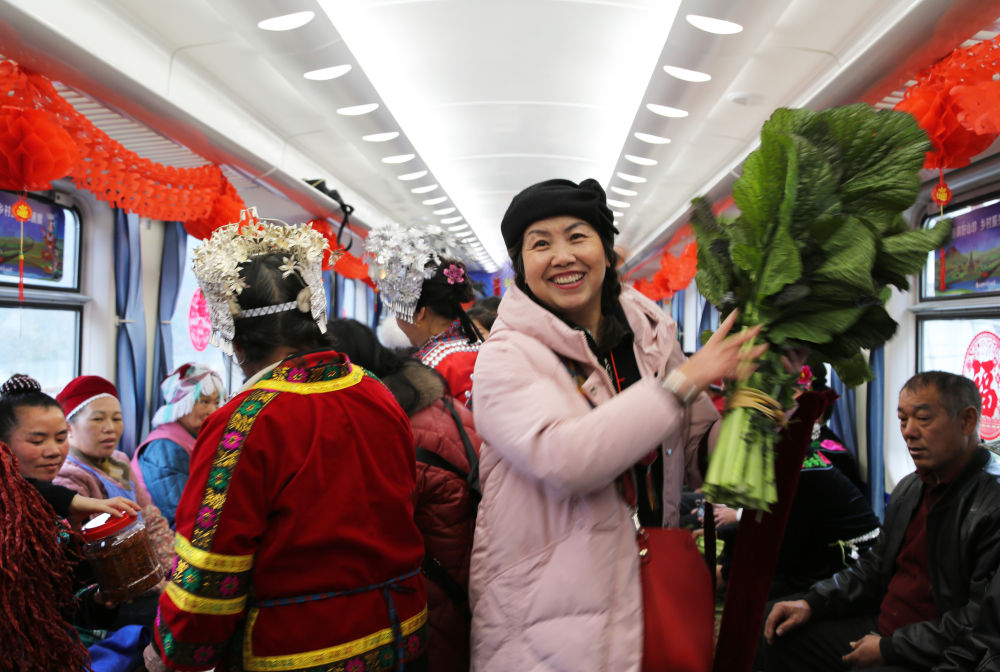 1月18日,在5640次列車上,乘客在“鄉(xiāng)村集市”車廂購買蔬菜。新華社發(fā)(余天英 攝)