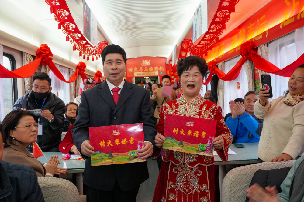 1月18日,一對金婚夫婦在5640次列車上舉行“村火車上的婚禮”。新華社發(fā)(龍建睿 攝)