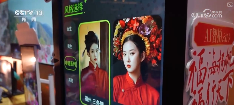 夜幕降臨,一場(chǎng)新春科技大秀在福州市的冶山春秋園上演了。泉州的簪花是福建文旅的頂流,在現(xiàn)場(chǎng),一臺(tái)AI旅拍機(jī)吸引了許多游客排隊(duì)體驗(yàn)。只要拍攝一張照片,就可以利用AI一鍵生成“簪花圍”造型,還能輕松在各種非遺裝扮之間來回切換。