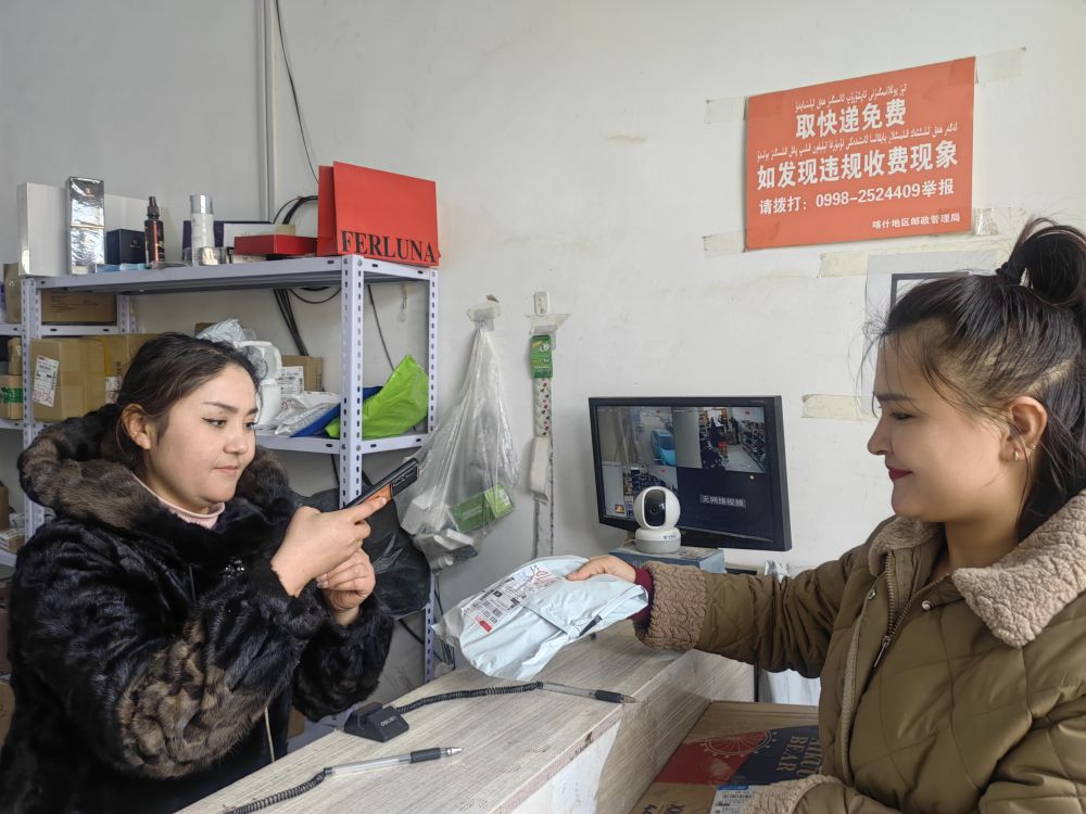 1月18日,在新疆喀什市荒地鄉(xiāng)一快遞代收點(diǎn),負(fù)責(zé)人塔吉尼沙·買買提力(左一)在為顧客掃描快遞單號(hào)。新華社記者蔡國(guó)棟 攝