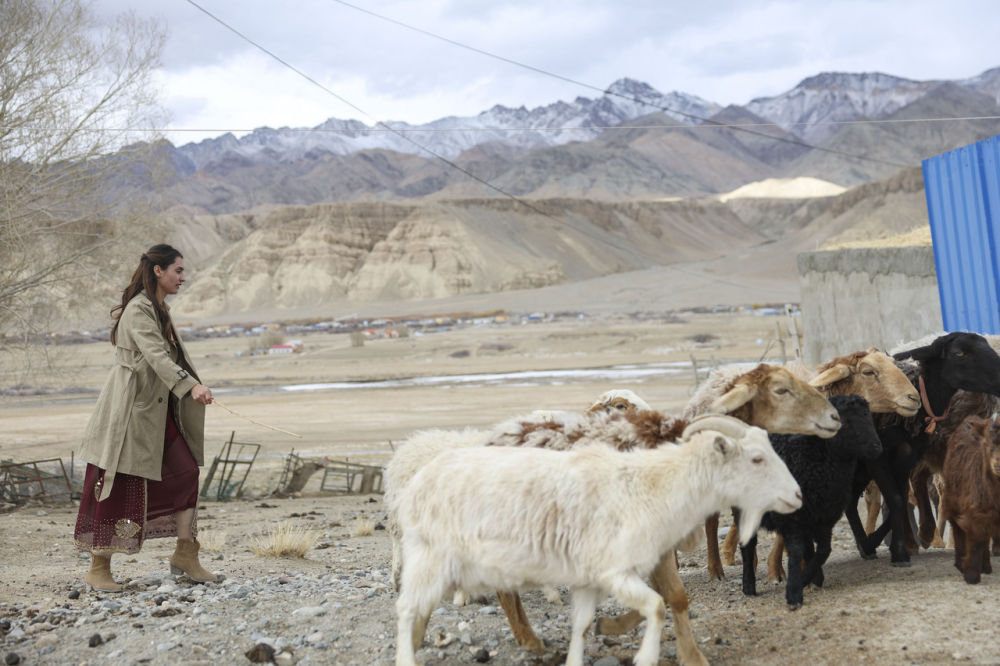 在瓦恰鄉(xiāng)夏布孜喀拉村,艾爾開(kāi)牙·多力開(kāi)幫忙將羊群趕回羊圈(2024年3月22日攝)。