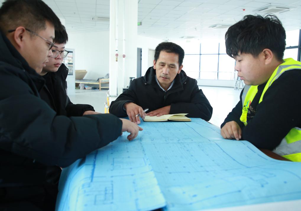 在項(xiàng)目部?jī)?nèi),周培(右二)和工作人員對(duì)工程操作注意事項(xiàng)進(jìn)行研討。(受訪者供圖)
