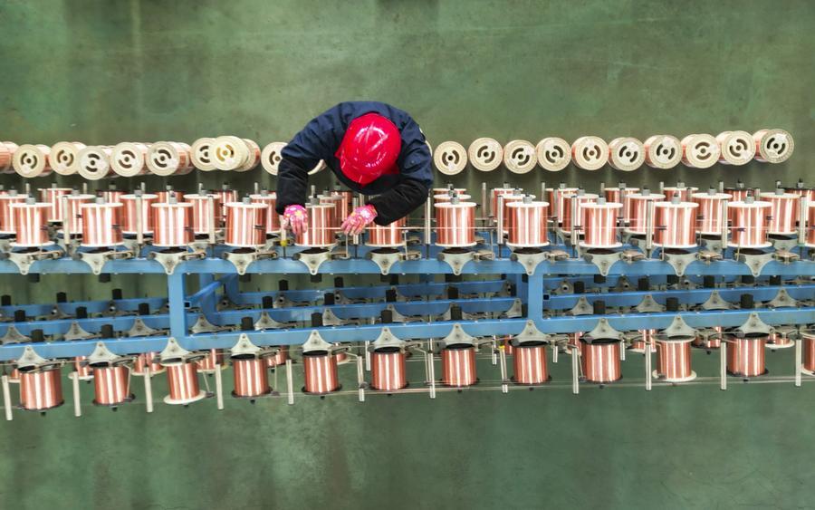 2月13日,在山東省東營市廣饒縣李鵲鎮(zhèn)的一家電纜公司的生產(chǎn)車間內(nèi),工人在進(jìn)行束絲作業(yè)(無人機(jī)照片)。新華社發(fā)(劉云杰攝)