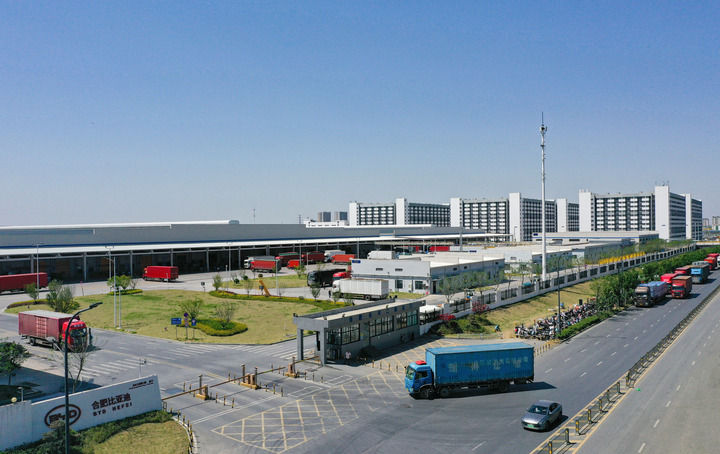 春風(fēng)和煦,楊柳輕舞,從合肥市區(qū)驅(qū)車向北約35公里,行至長(zhǎng)豐縣中南部的下塘鎮(zhèn),以比亞迪命名的主干道上,運(yùn)送汽車零部件的貨車排成長(zhǎng)長(zhǎng)一列,魚(yú)貫而入比亞迪合肥基地園區(qū)。