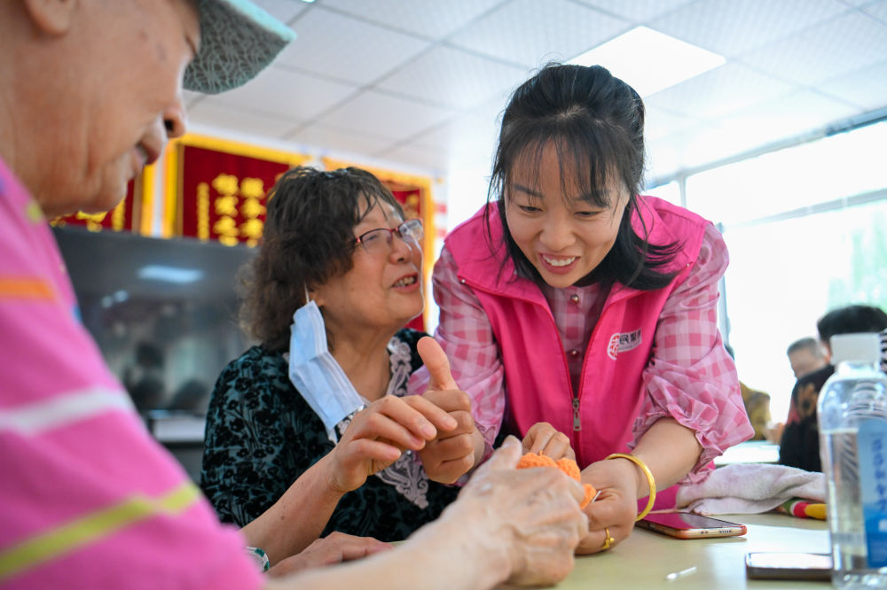 在天津市河西區(qū)賓西樓居家養(yǎng)老服務中心,劉緩緩(右)鼓勵一名在“老年大學”課上制作手工飾品的老人(5月23日攝)。新華社記者 孫凡越 攝
