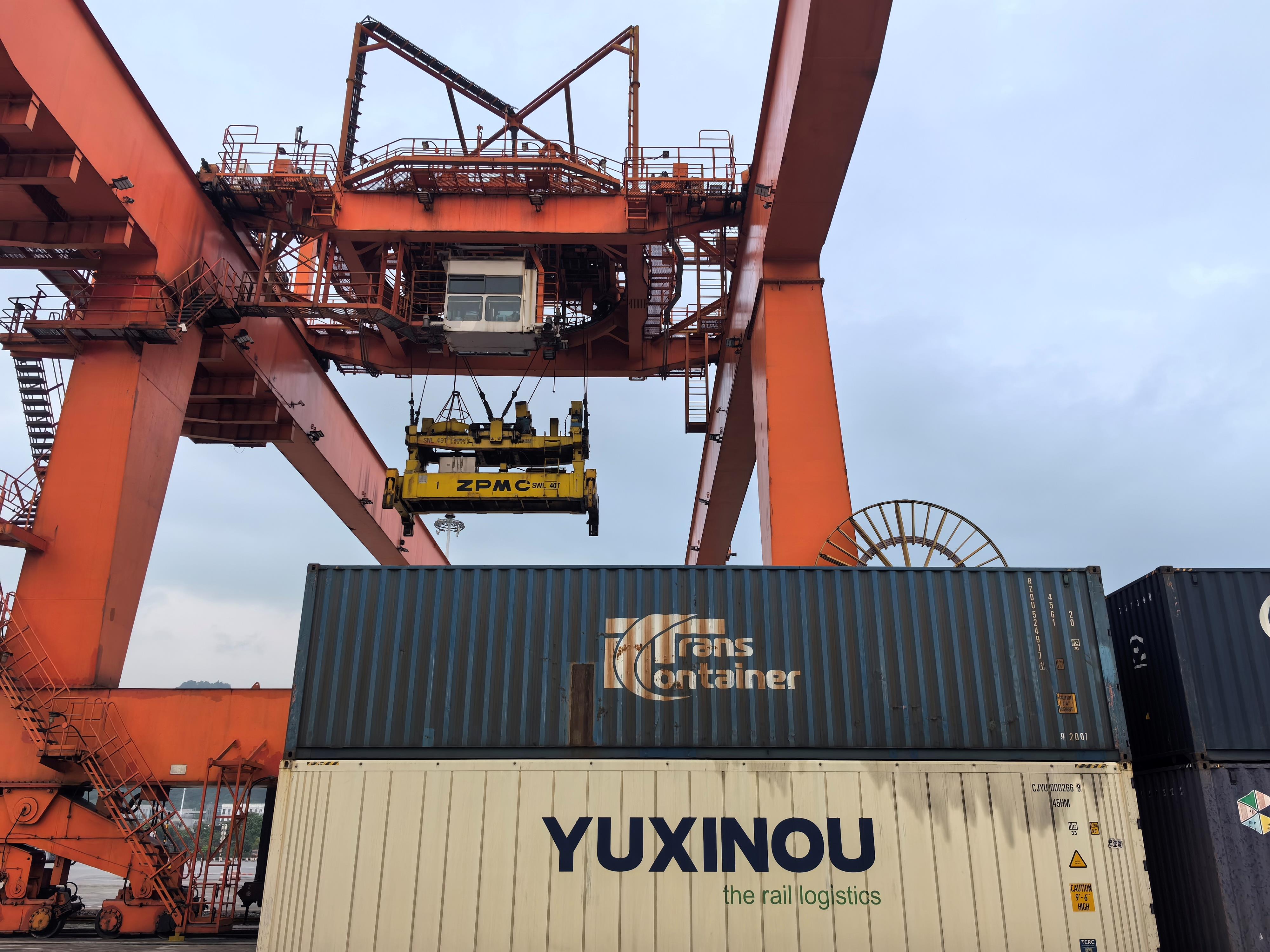 重慶國(guó)際物流樞紐園區(qū)內(nèi),中歐班列運(yùn)送的“渝新歐”集裝箱整齊排列。(總臺(tái)央廣記者潘毅拍攝)