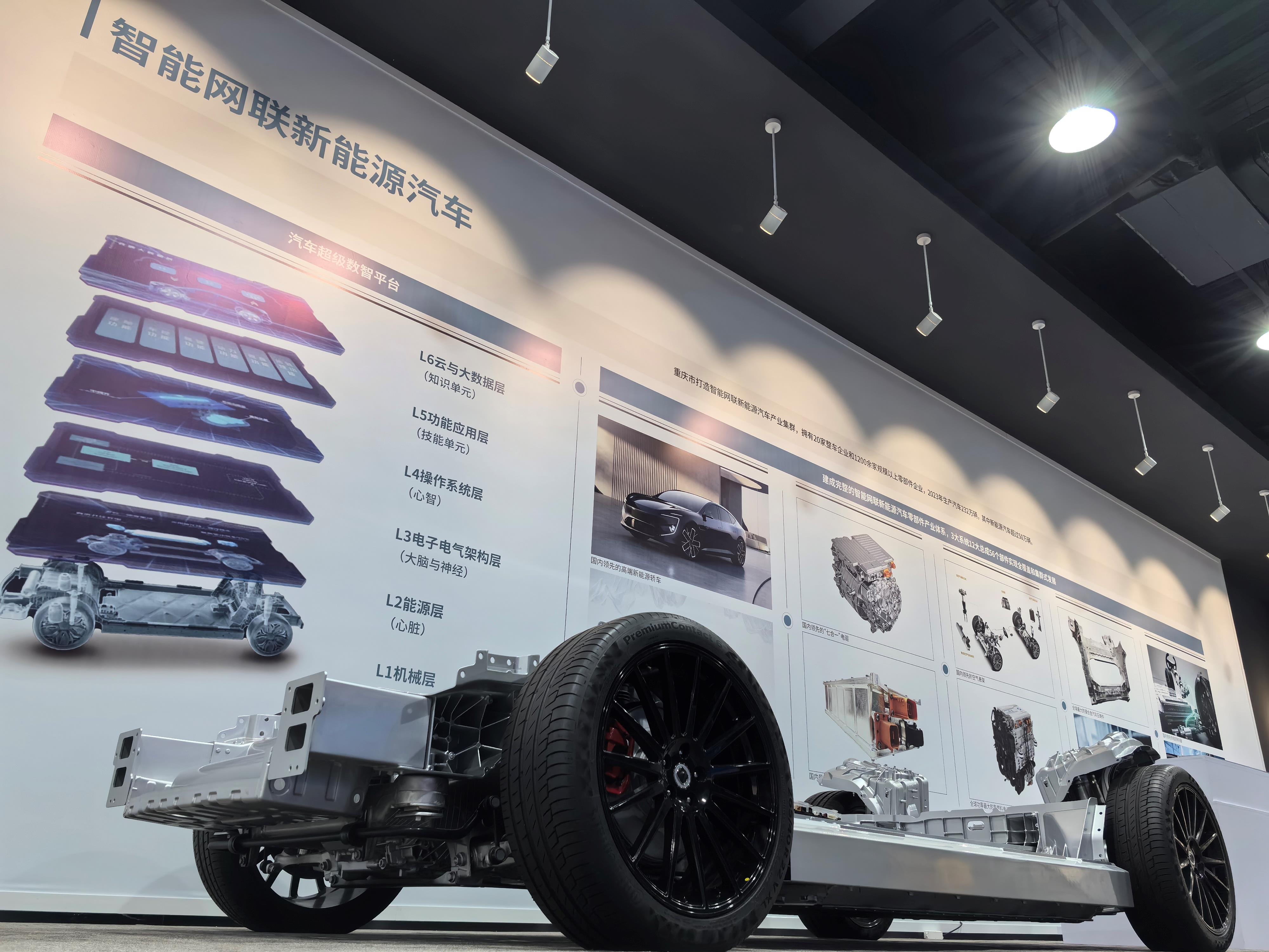 在重慶市科技創(chuàng)新和產(chǎn)業(yè)發(fā)展成果展示上的智能網(wǎng)聯(lián)新能源汽車部件。(總臺(tái)央廣記者潘毅拍攝)
