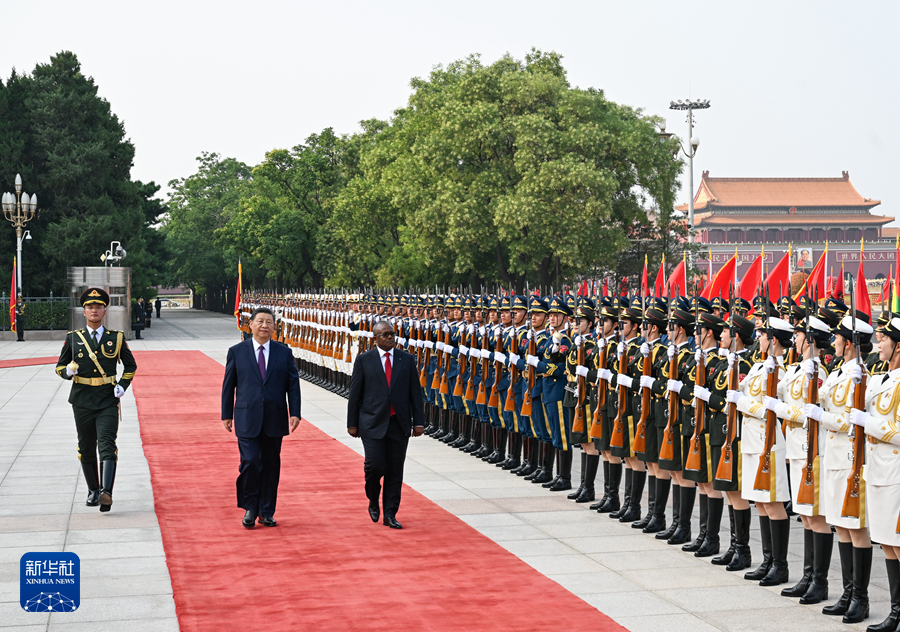 恩巴洛抵達時,禮兵列隊致敬。兩國元首登上檢閱臺,軍樂團奏中國和幾內(nèi)亞比紹兩國國歌,天安門廣場鳴放21響禮炮。恩巴洛在習(xí)近平陪同下檢閱中國人民解放軍儀仗隊,并觀看分列式。