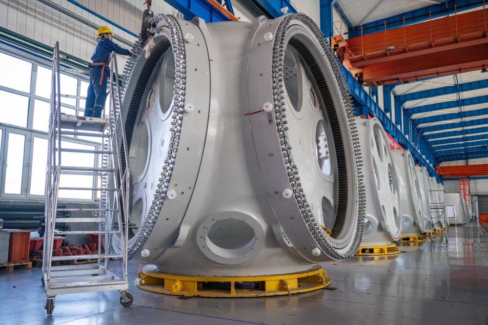 2024年4月28日,工作人員在中國一重集團(tuán)有限公司的風(fēng)電設(shè)備裝配車間內(nèi)加工風(fēng)電輪轂。