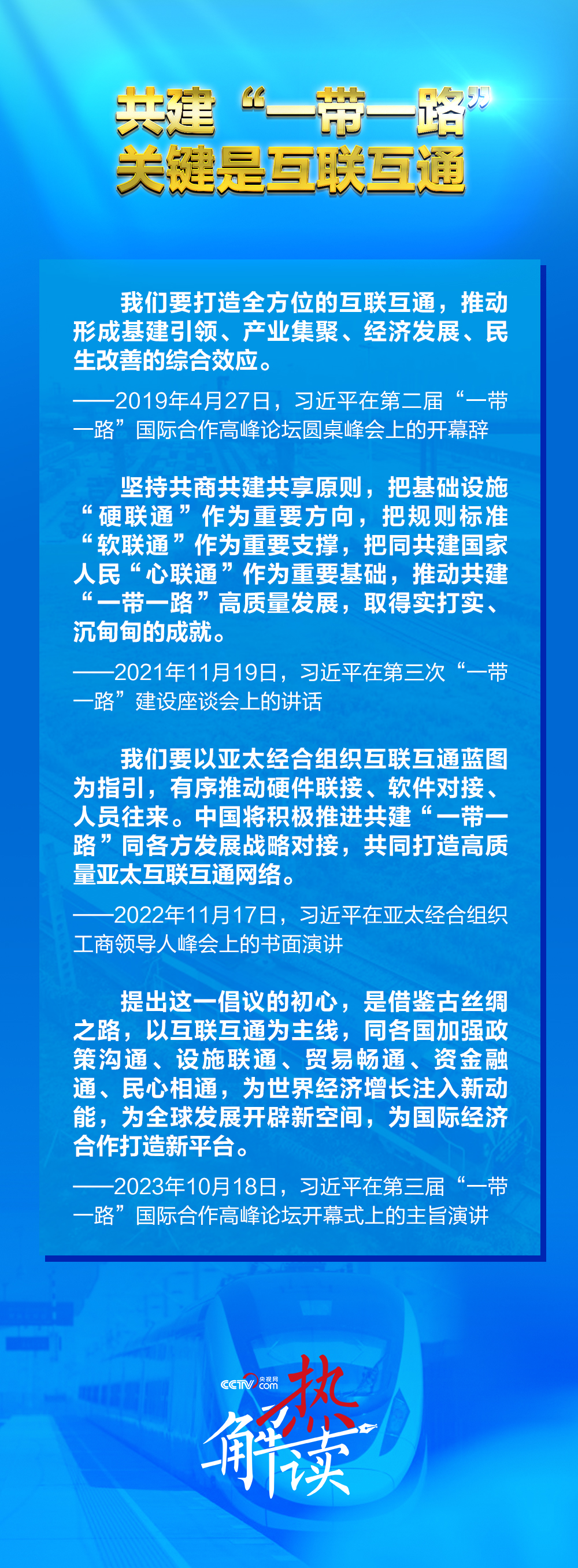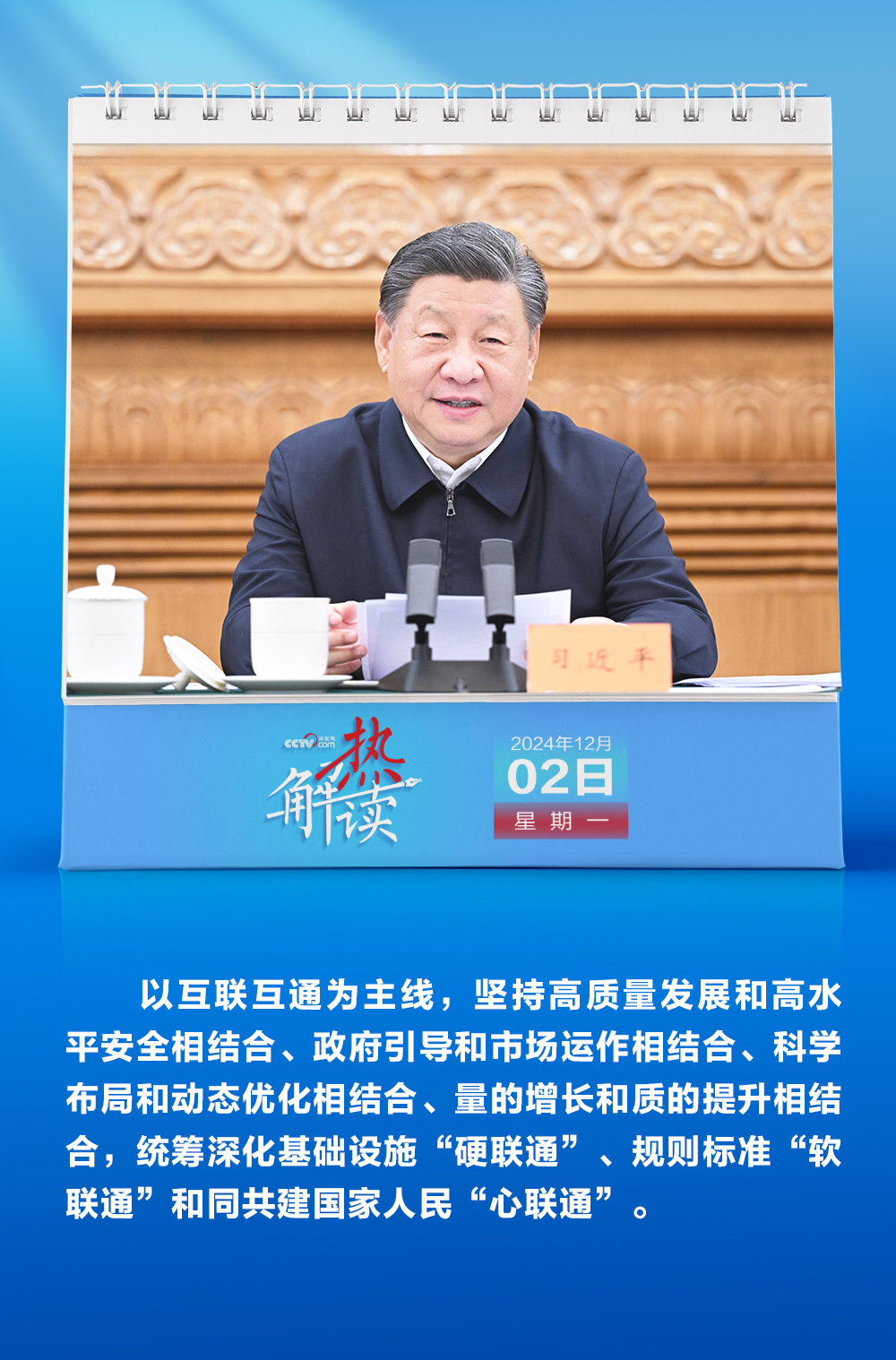 “統(tǒng)籌深化基礎(chǔ)設(shè)施‘硬聯(lián)通’、規(guī)則標(biāo)準(zhǔn)‘軟聯(lián)通’和同共建國(guó)家人民‘心聯(lián)通’”,“完善‘硬聯(lián)通’、‘軟聯(lián)通’、‘心聯(lián)通’協(xié)調(diào)推進(jìn)機(jī)制”。12月2日,習(xí)近平總書(shū)記在第四次“一帶一路”建設(shè)工作座談會(huì)上對(duì)深化三個(gè)“聯(lián)通”再作部署。