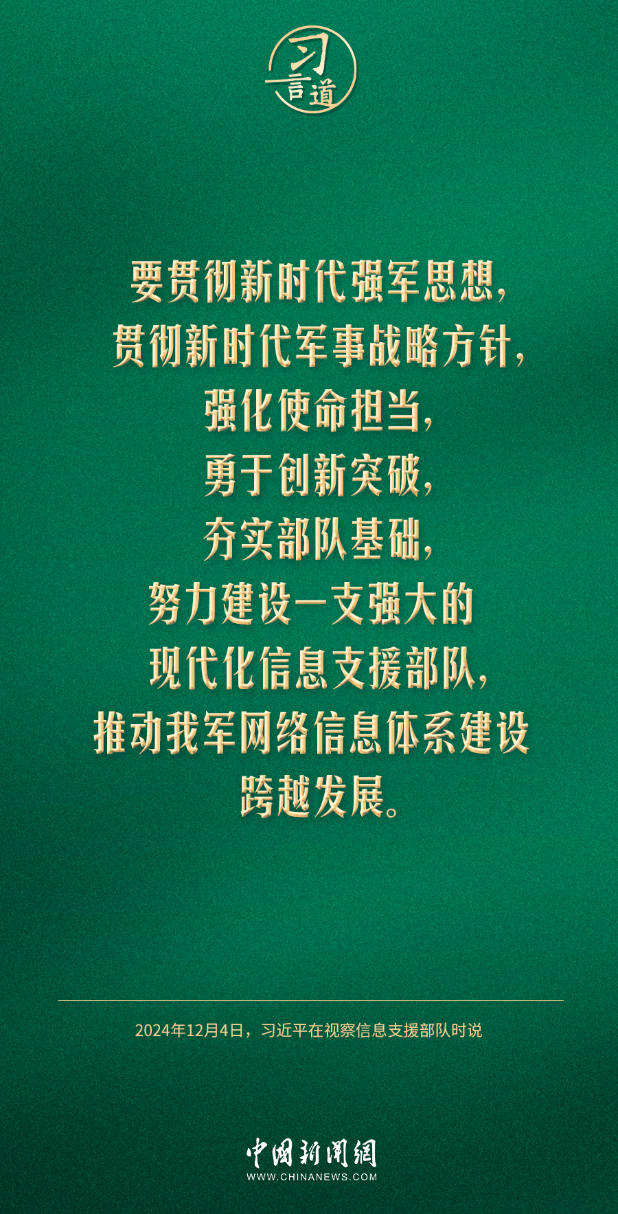 中共中央總書(shū)記、國(guó)家主席、中央軍委主席習(xí)近平4日視察信息支援部隊(duì),代表黨中央和中央軍委,對(duì)信息支援部隊(duì)第一次黨代表大會(huì)的召開(kāi)表示熱烈祝賀,向信息支援部隊(duì)全體官兵致以誠(chéng)摯問(wèn)候。習(xí)近平指出——