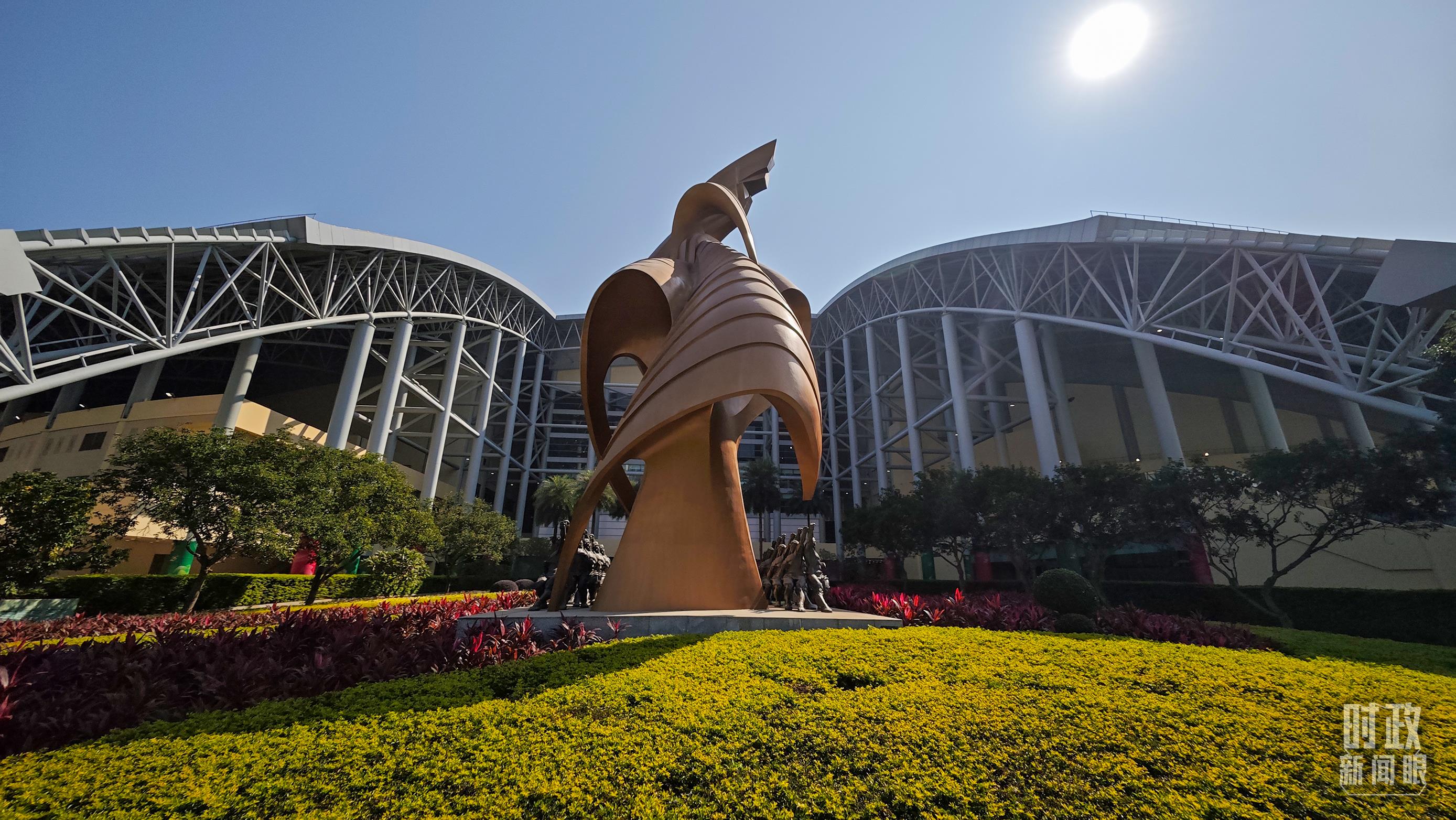 澳門東亞運(yùn)動(dòng)會(huì)體育館前,名為“揚(yáng)帆”的巨型雕塑熠熠生輝。(總臺(tái)央視記者彭漢明拍攝)