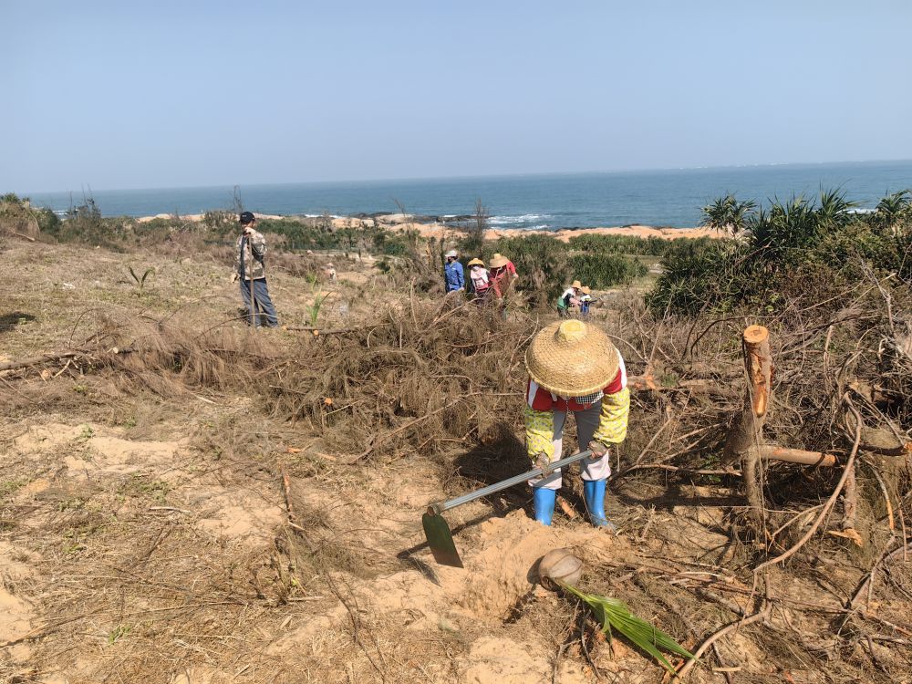 “和原來(lái)的木麻黃樹(shù)相比,椰子樹(shù)不僅抗風(fēng)能力更強(qiáng),也更加美觀?!惫と隧n吉衍嫻熟地將一鍬紅土鏟到剛種下的椰苗根部,并輕輕拍打夯實(shí),“這一片椰林要種280畝,我們每天干八九個(gè)小時(shí),這幾天就要種完。”