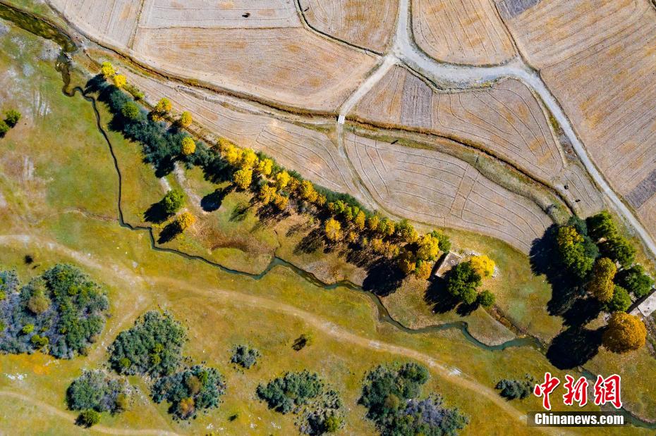 日喀則江孜縣境內(nèi)農(nóng)田、村居與金黃的樹林相映成趣。 何蓬磊 攝