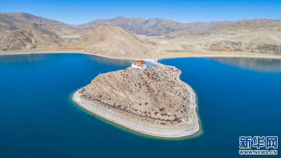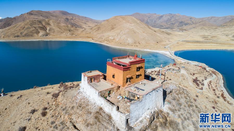 坐落于羊湖北岸一座小島上的日托寺(無人機照片,1月10日攝)。新華社記者 孫非 攝