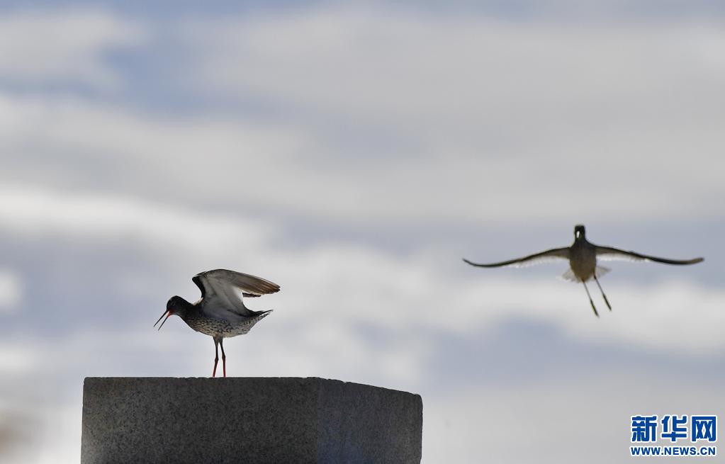紅腿鷸在拉魯濕地上起舞(6月2日攝)。新華社記者 張汝鋒 攝