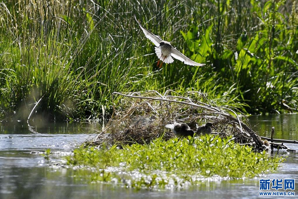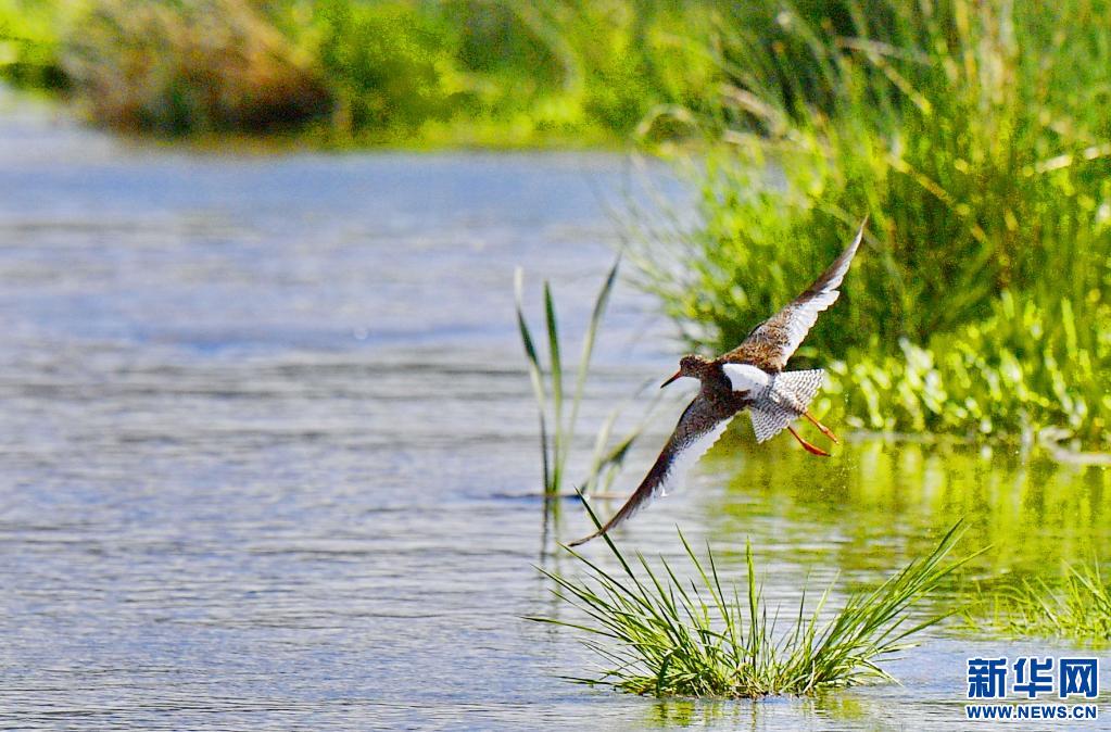 初夏,紅腳鷸在位于西藏拉薩的拉魯濕地國(guó)家級(jí)自然保護(hù)區(qū)內(nèi)起舞覓食。