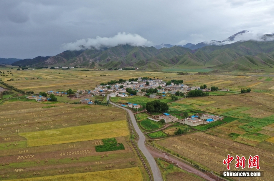 9月8日,西藏自治區(qū)拉薩市林周縣境內(nèi)的田野美景。金秋時節(jié),拉薩河谷一帶青稞成熟,呈現(xiàn)豐收美景。(無人機(jī)照片)中新社記者 貢嘎來松 攝