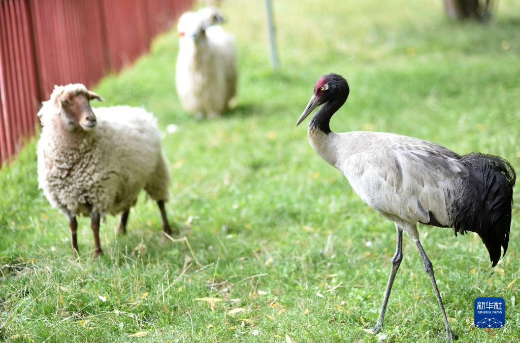 9月8日,黑頸鶴站在羊群中。新華社記者 覺果 攝
