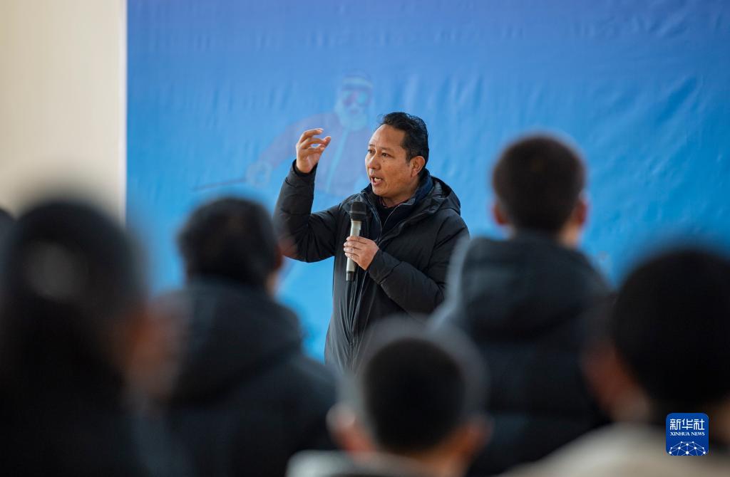 12月30日,西藏自治區(qū)體育局局長尼瑪次仁在國家體育總局“大心臟計(jì)劃”西藏自治區(qū)訓(xùn)練營開營儀式現(xiàn)場,向?qū)W員們介紹訓(xùn)練營情況。新華社記者 孫非 攝