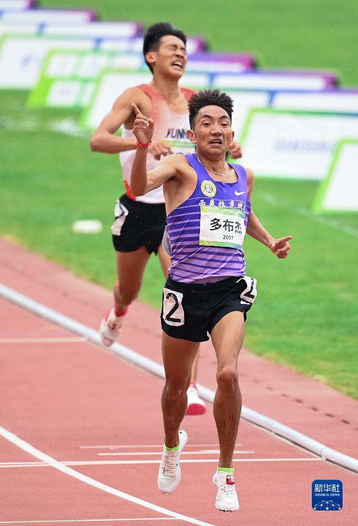 在第十四屆全運(yùn)會(huì)田徑項(xiàng)目男子5000米決賽中,西藏隊(duì)選手多布杰(前)以13分49秒16的成績奪冠(2021年9月23日攝)。新華社記者 宋彥樺 攝