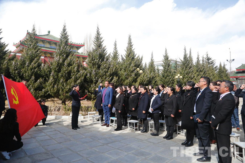 圖為山南市委宣傳部干部在莊嚴(yán)的黨旗下重溫入黨誓詞