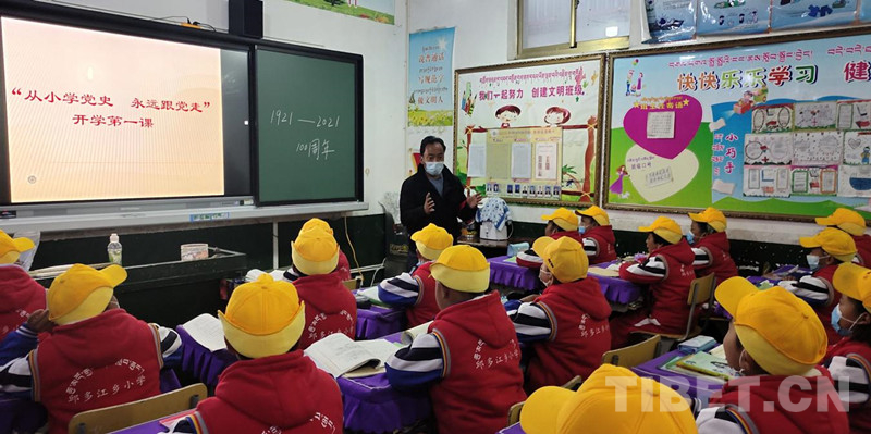 圖為山南市曲松縣邱多江鄉(xiāng)小學(xué)開展“從小學(xué)黨史 永遠(yuǎn)跟黨走”開學(xué)第一課活動(dòng)
