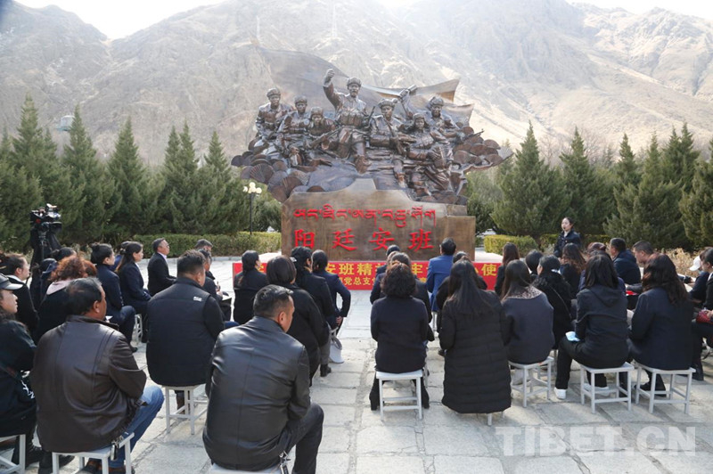 圖為山南市黨員干部在“陽廷安班”雕塑前聆聽英雄事跡