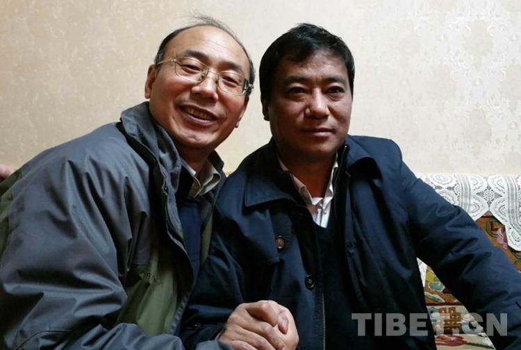 這是唐召明(左)與時(shí)任那曲地區(qū)發(fā)改委主任楊東升(右)在楊東升家中相聚時(shí),合影留念(楊東升家人2014年12月27日攝)