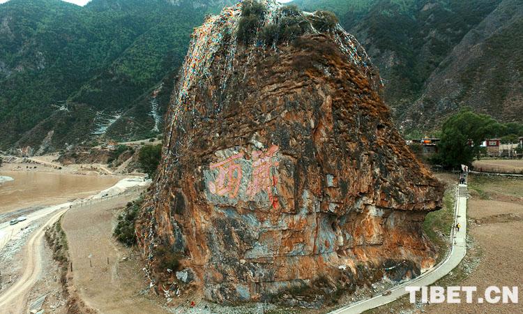 圖為江達(dá)縣崗?fù)墟?zhèn)崗?fù)写?,十八軍?zhàn)士刻下的“西藏”兩個(gè)大字 攝影:陳衛(wèi)國(guó)