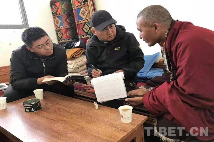 圖為西藏自治區(qū)藏語委辦(編譯局)黨組成員、副主任(副局長)加永曲加和同事調(diào)研新詞術語相關情況