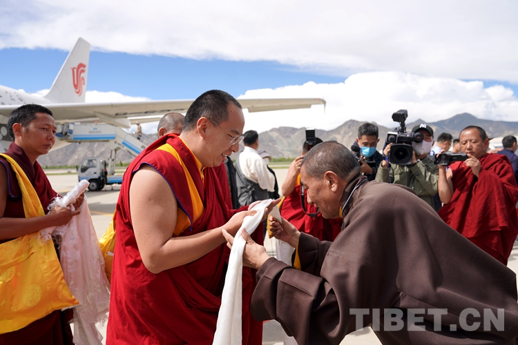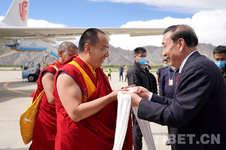西藏自治區(qū)黨委常委、統(tǒng)戰(zhàn)部部長(zhǎng),區(qū)政協(xié)黨組副書(shū)記、副主席旦科等西藏自治區(qū)相關(guān)領(lǐng)導(dǎo)在貢嘎機(jī)場(chǎng)迎接,互敬哈達(dá)。