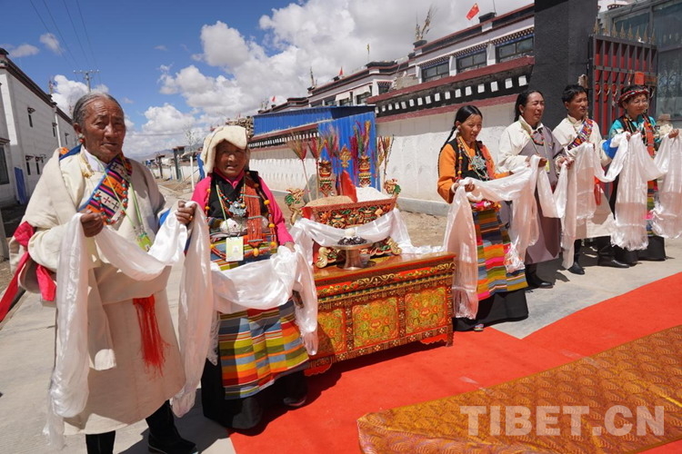 位于薩迦縣扯休鄉(xiāng)東北部的嘎吉林村,是庫區(qū)搬遷新村,2020年3月,全村139戶769人從海拔4000多米的土坯房搬遷到了這里海拔3800米的新房。得知班禪要來的喜訊,嘎吉林村村民及信教群眾身著節(jié)日盛裝、手捧潔白哈達(dá),一早就自發(fā)聚集在村廣場上迎候班禪。村民旦珍高興地對記者說道:“自從搬到這兒以后,政府給我們每人分了5.5畝田地,每戶人家都享受著國家搬遷優(yōu)惠政策,住上了福利幸福房。尤其是有了村里的集體合作社,再也不用像以前那樣單打獨斗各家做各自的事了?,F(xiàn)如今,無論是生活還是經(jīng)濟(jì)收入都一年比一年好?!?/p>