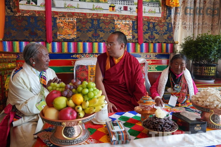 中午時分,班禪結(jié)束了對拉洛水利的調(diào)研,到扯休鄉(xiāng)嘎吉林村看望搬遷群眾,熱情的村民迎上前來向班禪獻(xiàn)上哈達(dá)和切瑪,班禪高興地?fù)]手致意。班禪緩步來到村民歐珠老人家。班禪為家里的老人摸頂賜福,端坐在歐珠家人當(dāng)中,詳細(xì)詢問搬遷后的生產(chǎn)生活情況。得知歐珠老人一家在搬遷后住房條件、生活條件等都有顯著改善,班禪感到十分欣慰。