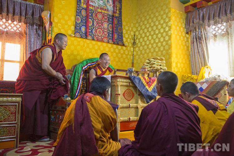 班禪講經(jīng)、禮佛后,在納塘寺主殿二樓一間經(jīng)堂內(nèi)特意現(xiàn)場抽查測試了年輕僧人對佛經(jīng)的背誦學(xué)習(xí)情況,聽取四批僧人背誦經(jīng)文,并隨機(jī)提問。聽到僧人們對答如流,班禪頻頻點(diǎn)頭、微笑肯定。