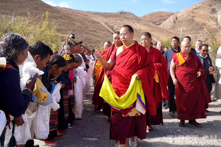 沿途農(nóng)牧區(qū)的信教群眾聞訊前來,身著傳統(tǒng)節(jié)日盛裝、手捧潔白哈達(dá),隊(duì)伍綿延數(shù)里,虔誠迎候班禪的到來。每當(dāng)遇到前來迎接的信教群眾,班禪便示意車輛緩行,開窗向信眾揮手致意,氣度不凡又格外親切。