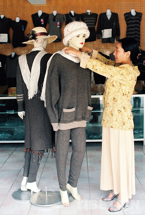 這是那曲地區(qū)(現(xiàn)那曲市)班戈縣絨毛分梳廠拉薩門(mén)市部經(jīng)理阿吉姆正在整理所經(jīng)銷(xiāo)的牦牛絨衫。由于牦牛絨衫相對(duì)于羊絨衫價(jià)格低、質(zhì)量好,在拉薩市場(chǎng)很受人們歡迎(唐召明1997年攝)