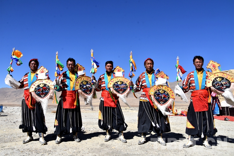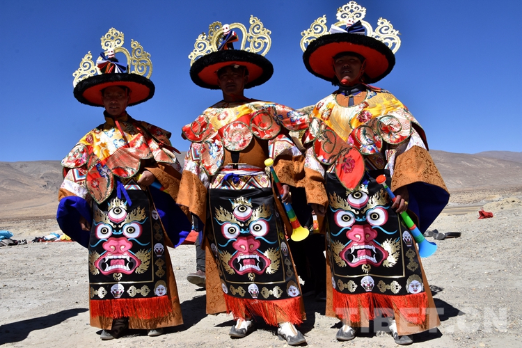 圖為曲堆藏戲隊(duì)隊(duì)員身著跳神服(跳神環(huán)節(jié)也是曲堆藏戲的特色)攝影:拉姆