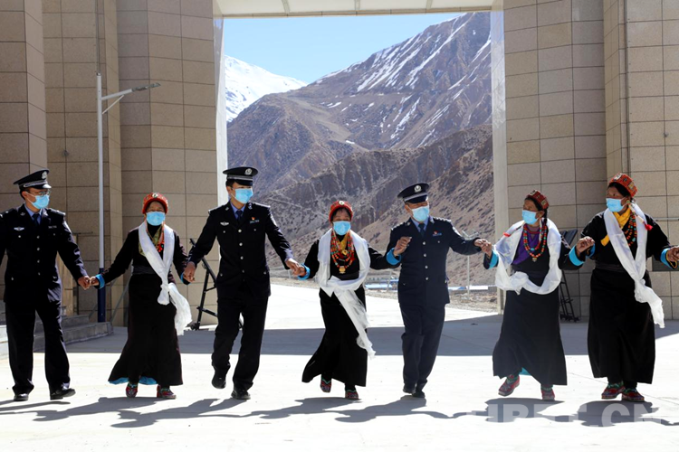圖為在普蘭口岸,邊民群眾與民警共跳傳統(tǒng)鍋莊舞 攝影:格熱