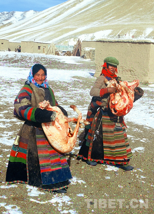這是雙湖特別區(qū)(現(xiàn)雙湖縣)嘎措鄉(xiāng)一村兩位牧女從村里倉庫領到集體分配的羊肉回家(唐召明2001年攝)